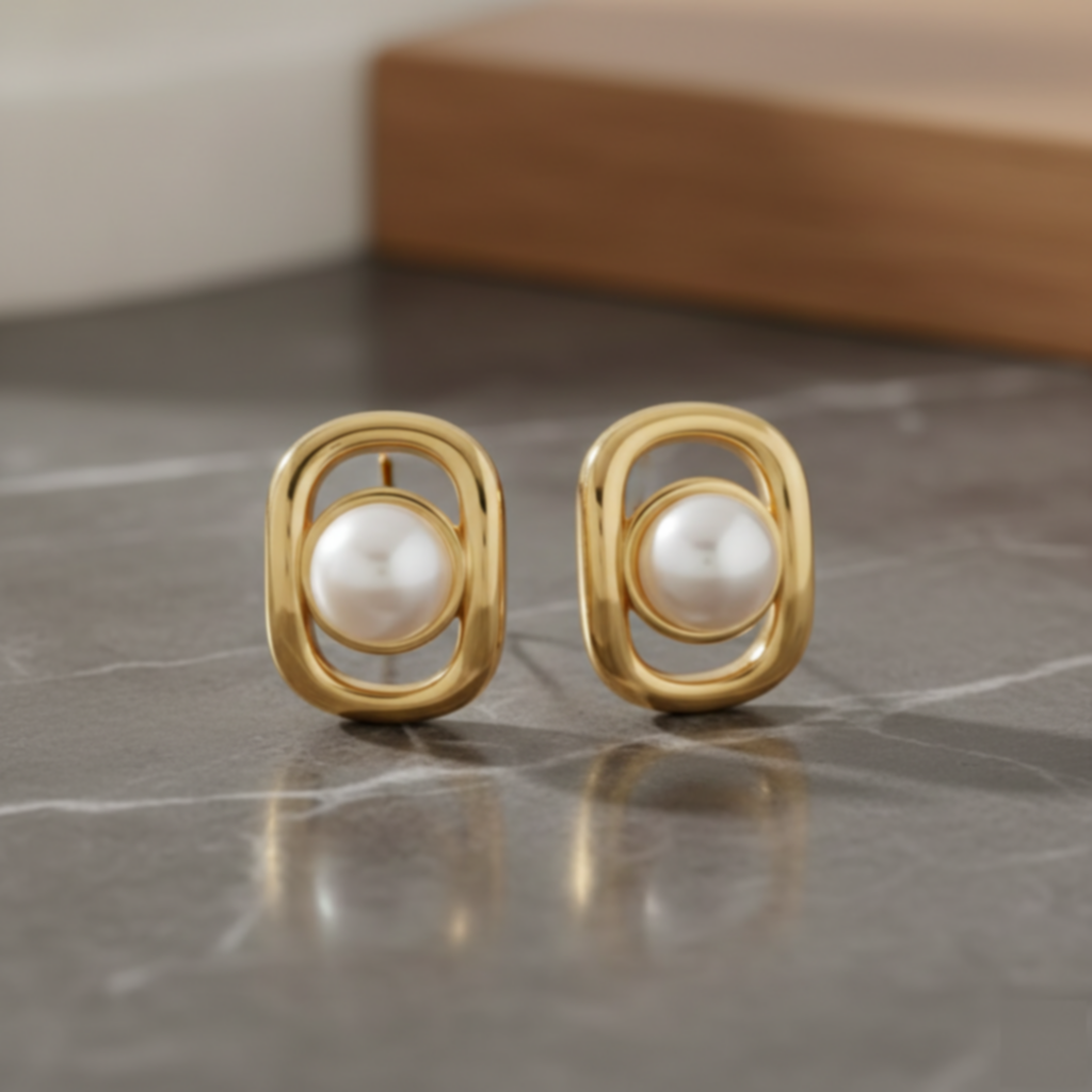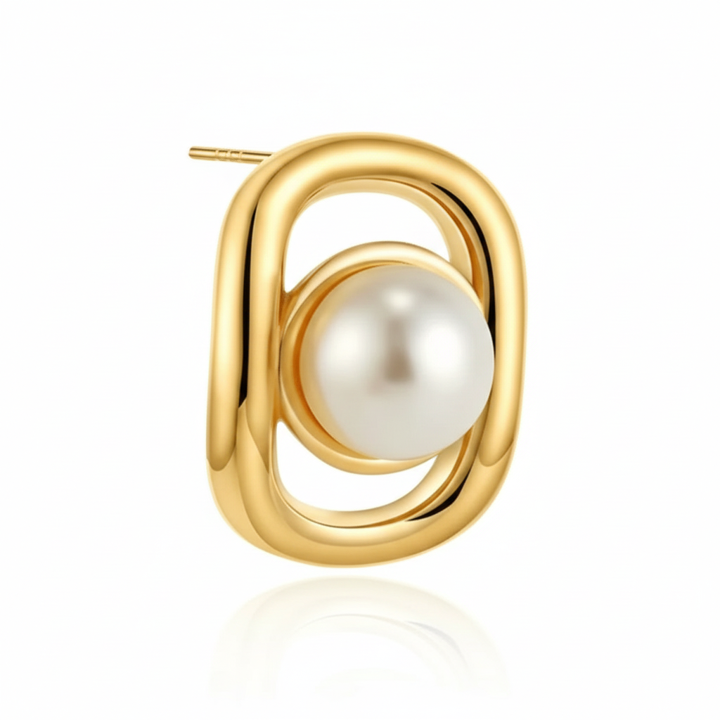 PinkWynk Golden Oval Pearl Stud Earrings